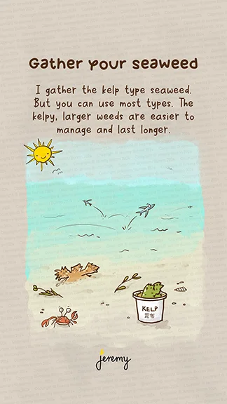 Grab a bucket and hit the beach. The kelp type of seaweed works well but you can use anything. Throw it in the bucket after you’ve removed any sea creatures.