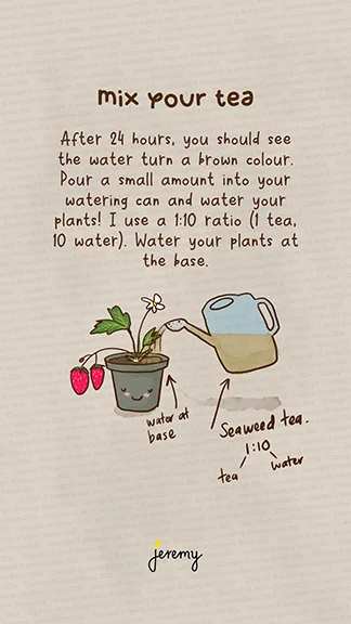 Put a small amount into a watering can and mix it to a ratio of 1 part tea to 9 of water (yes, my diagram below is wrong!). Try watering around the plants just a little to begin with.