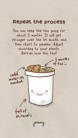 You can keep the process going for ages. It will get stronger and stronger, so dilute it further as it ages. Test it out on your plants and see how they respond. I’ve found that berries love it!